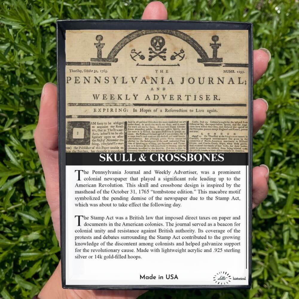 The Pennsylvania Journal and Weekly Advertiser, was a prominent colonial newspaper that played a significant role leading up to the American Revolution. This skull and crossbones design is inspired by the masthead of the October 31, 1765 “tombstone edition.” This macabre motif symbolized the pending demise of the newspaper due to the Stamp Act, which was about to take effect the following day.